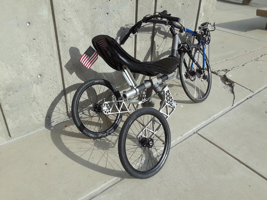 The first prototype, pictured above, was built by a student group at the University of Wisconsin-Milwaukee to compete in the 2019 ASME Human Powered Vehicle Challenge and uses a moving bottom bracket, generously donated by Cruzbike, handlebars and stem temporarily loaned by an old Burley recumbent, and an aggressively recumbent seat angle the students chose for their competition, none of which are integral to the tilting trike functionality.